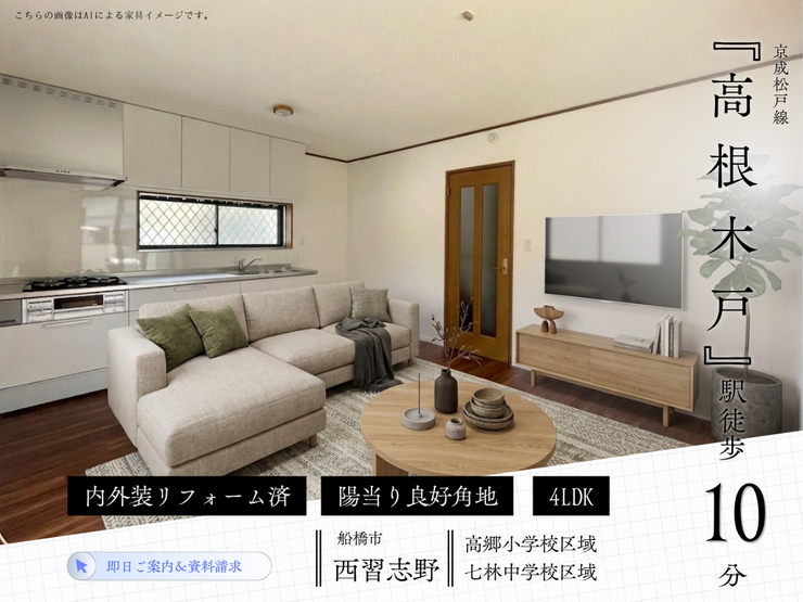 | 周辺環境 | 船橋こどもの木保育園 徒歩4分 (約280m) 中條医院 徒歩4分 (約270m) 高根木戸駅 徒歩7分 (約510m) 高郷小学校 徒歩5分 (約360m) イオン高根木戸店 徒歩8分 (約600m) 京葉銀行高根支店 徒歩8分 (約600m) ローソン船橋西習志野一丁目店 徒歩7分 (約540m) 高根台パール公園 徒歩6分 (約450m) セブン-イレブン 船橋芝山6丁目店 徒歩9分 (約690m) 木戸脇幼稚園 徒歩9分 (約690m) |